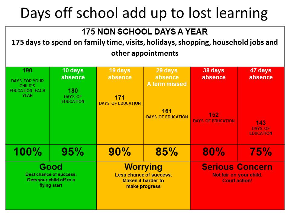Absence letters sent home fortnightly, lateness letters after 3 lateness in a ½ term. Meetings with Inclusion Team and if necessary Educational Welfare Officer