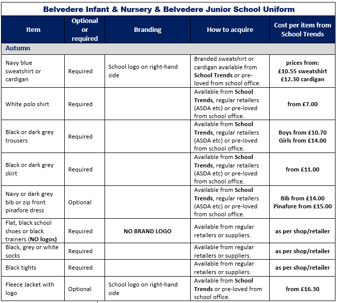 Belvedere Infant & Nursery and Belvedere Junior School Governors and staff believe that all children should wear school uniform in order for them to feel part of our school family. The wearing of uniform reflects pride in our school and is chosen to be comfortable and practical.
