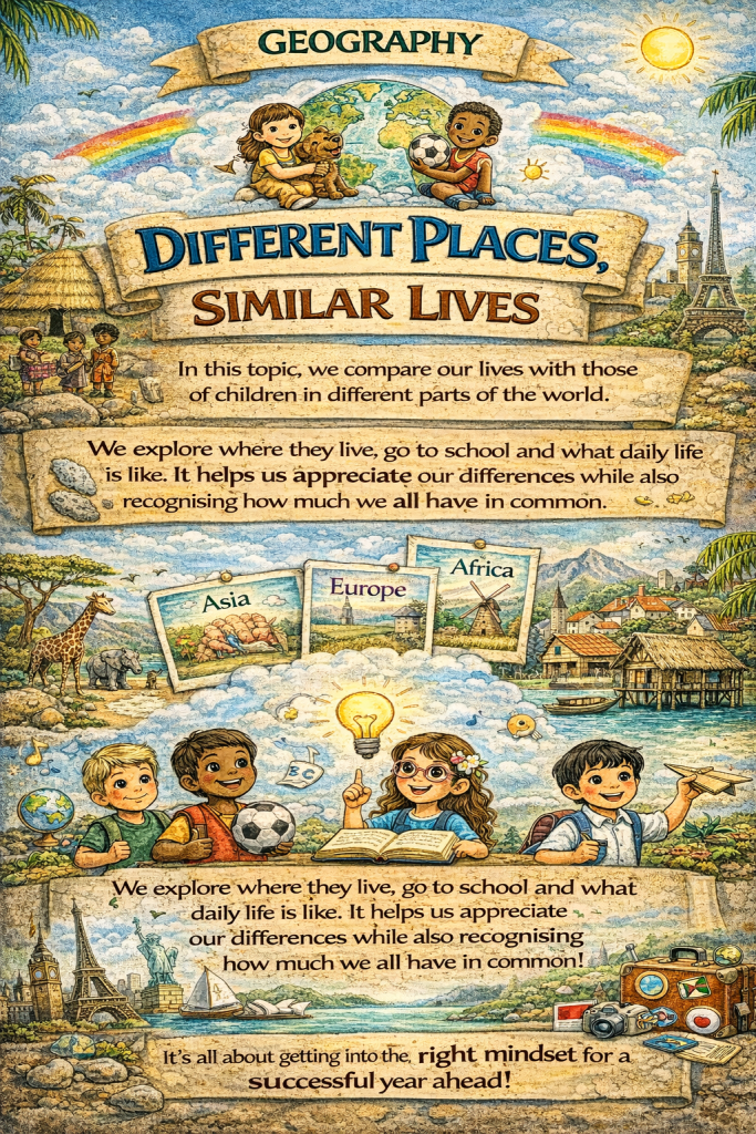 In this topic, we compare our lives with those of children in different parts of the world. We explore where they live, go to school and what daily life is like. It helps us appreciate our differences while also recognising how much we all have in common. A great way to become global citizens!