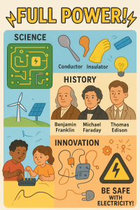 Electricity is one of the most important discoveries ever made and we have learnt how to use it to power almost every aspect of our lives. But who discovered electricity and how does it work? As scientists, we will investigate how electricity flows in different circuits, different materials that make good electrical conductors and insulators, explore new inventions that use renewable energy to generate electricity and how to be safe around electricity. As historians, we will find out the significant contributions of different scientists in the history of electricity. As designers and innovators, we will harness the power of electricity to create games.