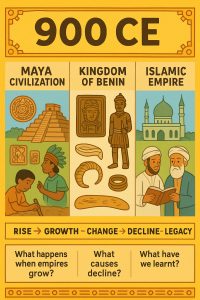 We will be learning that at 900 CE different ancient civilizations were rising and declining across the world. We will study the ancient Mayan civilization, the Kingdom of Benin and the rise of the Islamic empire. We will need to be historians and use artefacts and historical sources to make observations about the life cycle of civilizations and the legacies they leave us. What happens when empires grow? What causes change and decline? What have we learnt from these past civilisations?