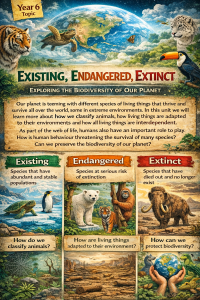 Our planet is teeming with different species of living things that thrive and survive all over the world, some in extreme environments. In this unit we will learn more about how we classify animals, how living things are adapted to their environments and how all living things are interdependent. As part of the web of life, humans also have an important role to play. How is human behaviour threatening the survival of many species? Can we preserve the biodiversity of our planet?